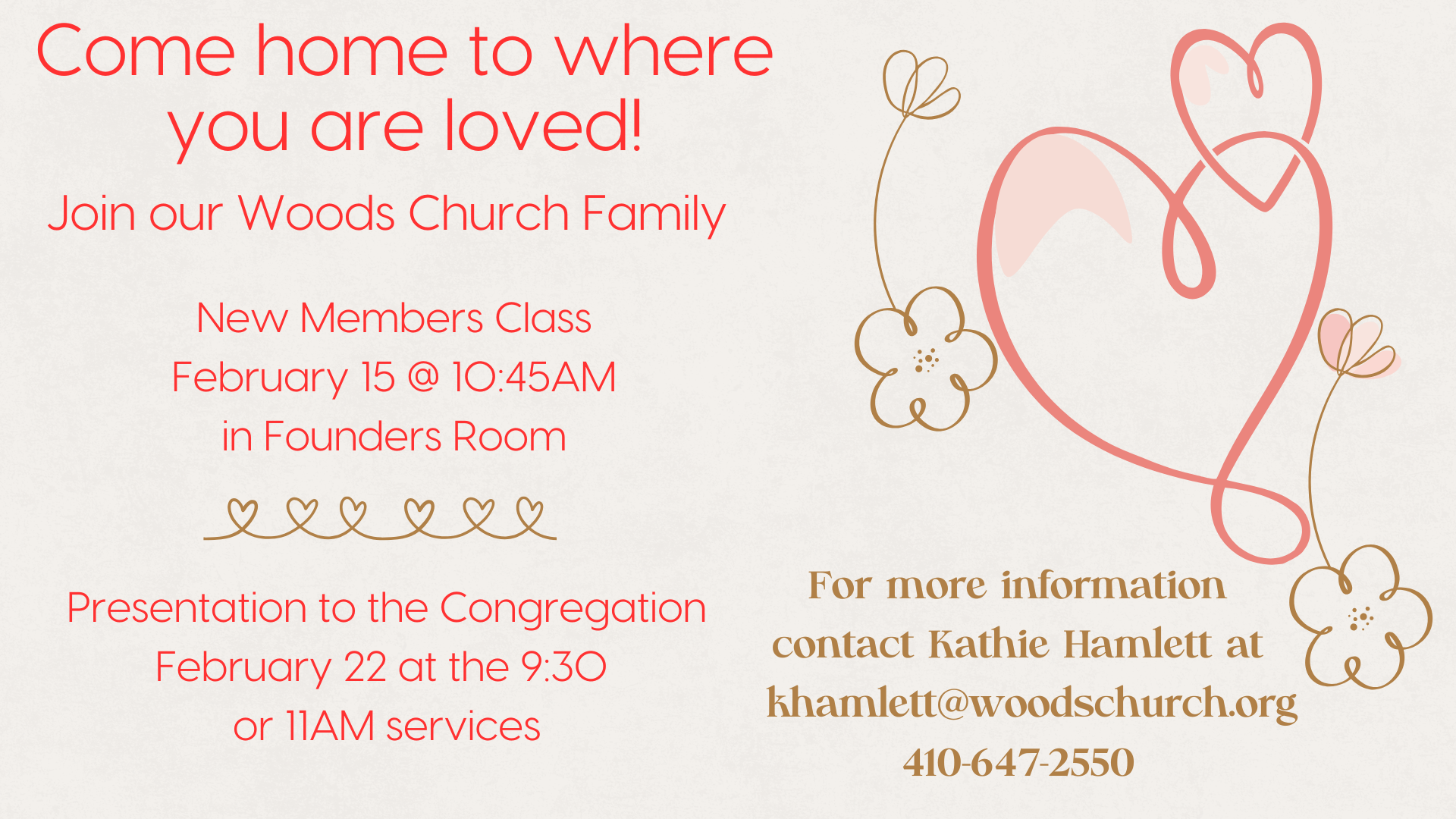 We would love for your to join our family! Our next new members class, which was scheduled for Sunday, February 1, will now be held on Sunday, February 15, 10:45AM, in Founders Room.