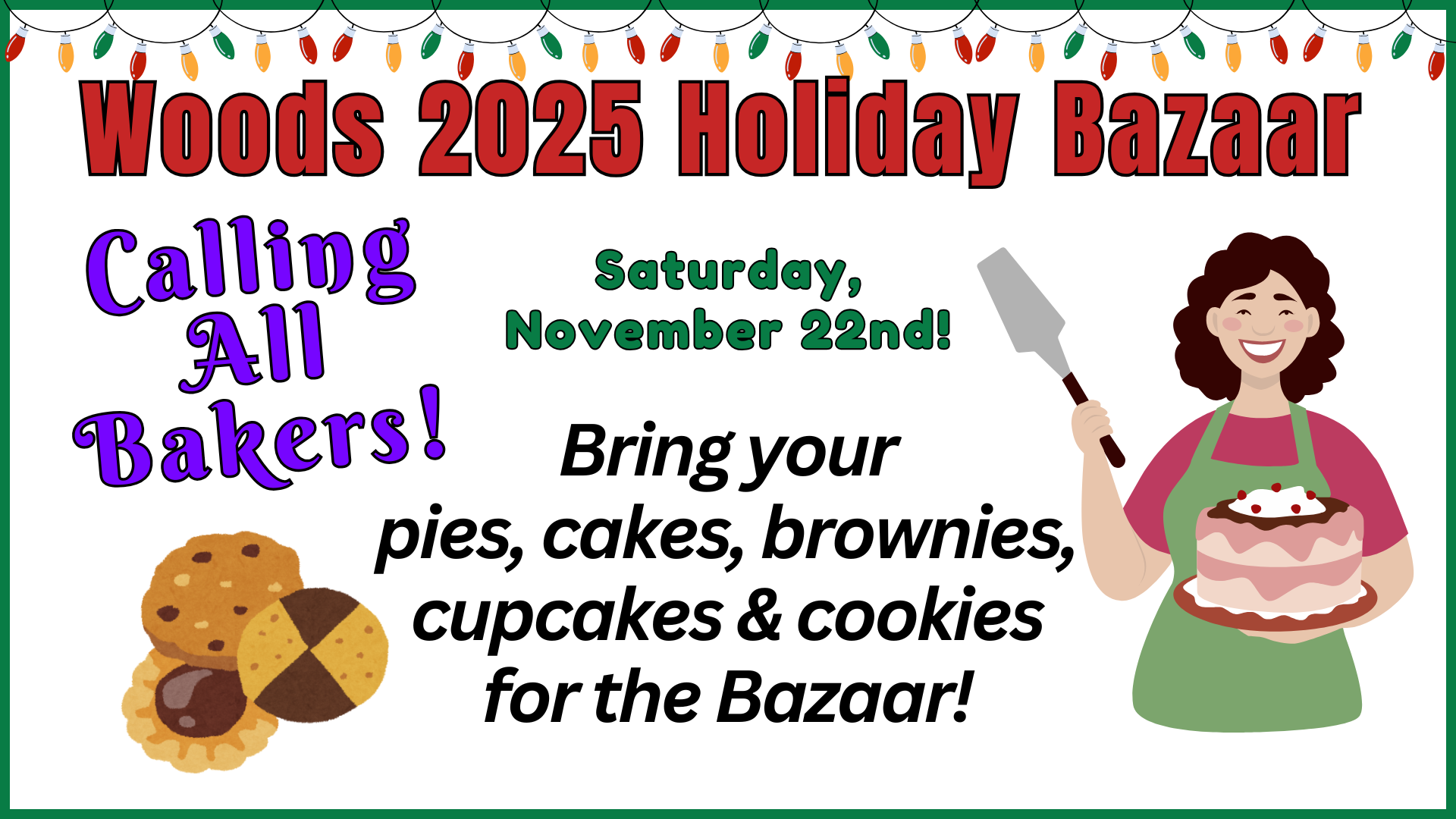 Calling all bakers! Bring your pies, cakes, brownies, cookies, cupcakes, and other treats to be sold at the Baked Goods Table. Drop off the goodies on Friday, November 21 or early Saturday morning.