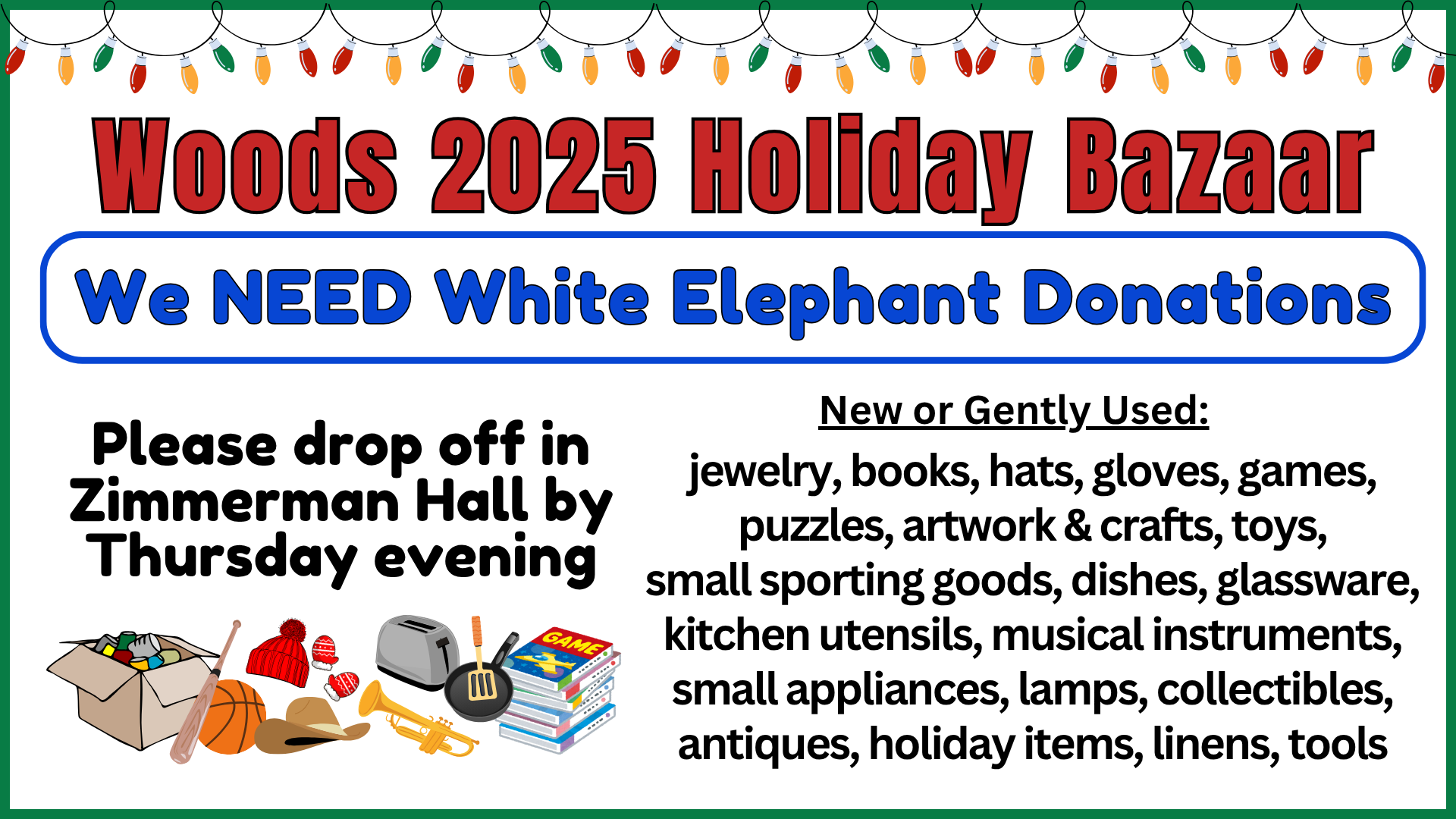 We are currently collecting donations for our Holiday Bazaar’s White Elephant Sale, including costume jewelry, books, plus Christmas and holiday items.