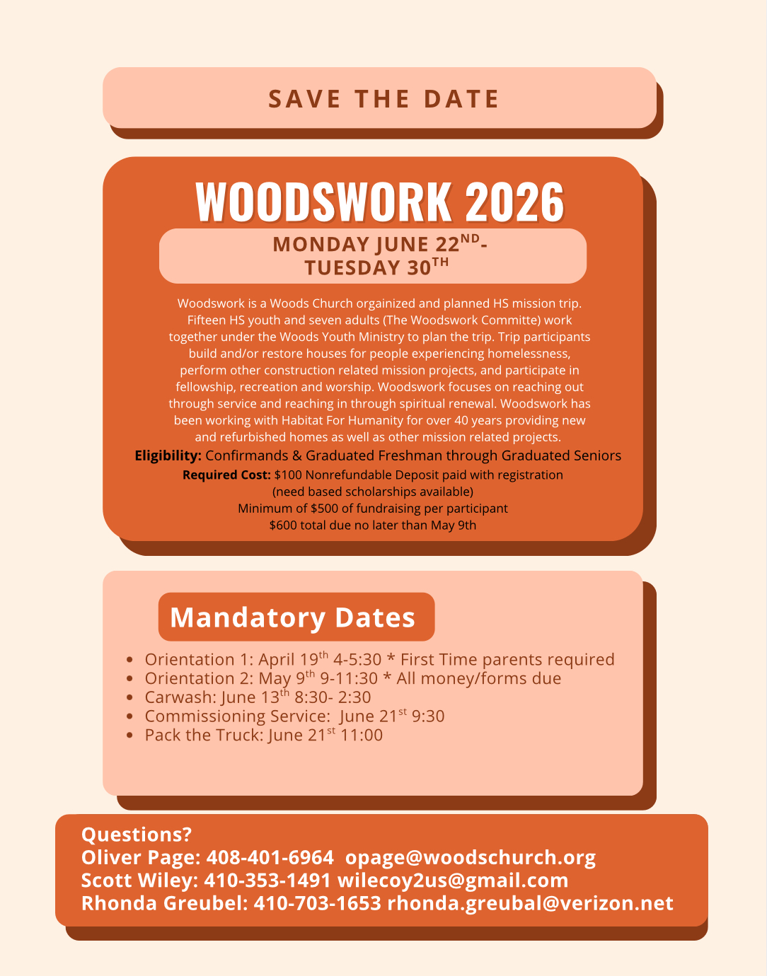 WoodsWork 2026 will be held June 22–30. We are still finalizing our location, but we are hoping to open registration by the end of the year! Download the flyer for more details.