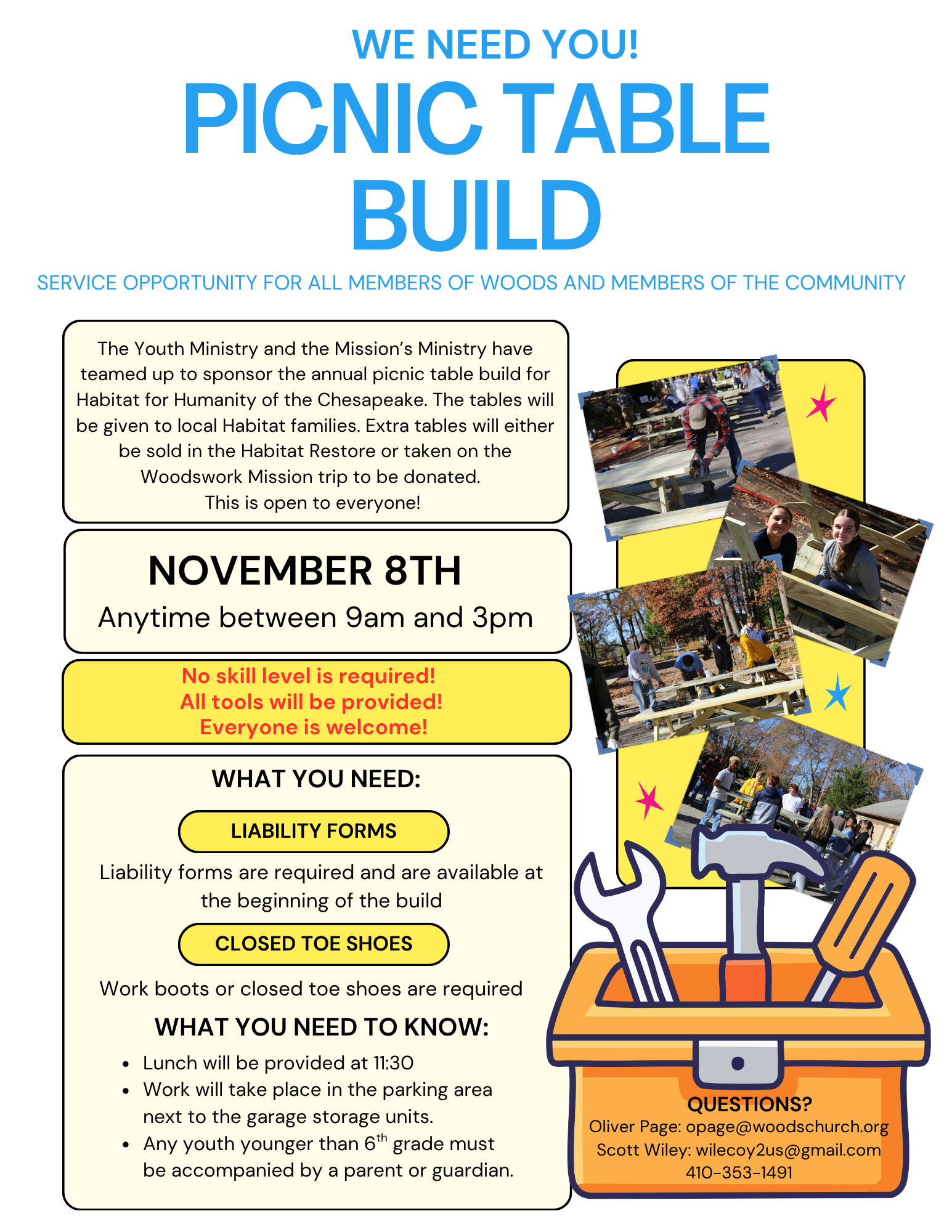 Our annual Picnic Table Build, hosted by WoodsWork, will be held on Saturday, November 8, 9AM–3PM. Click the button below for more details. We hope you can join us! Download flyer