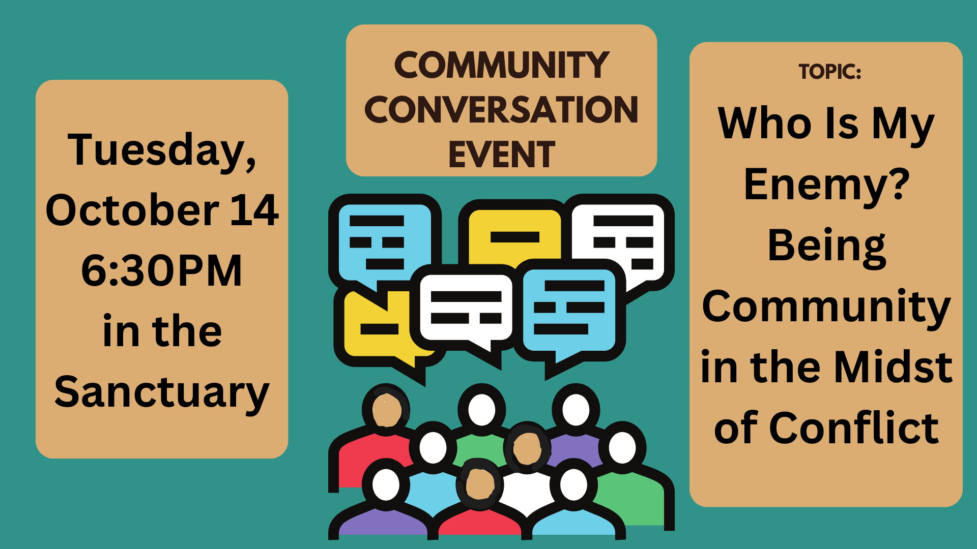 This event is open to the public, and a “Conversation Covenant” will be explained and followed in order to preserve a “brave space” for people to speak transparently about sensitive issues. Join us as we both seek and model the possibility of community in the midst of conflict.
