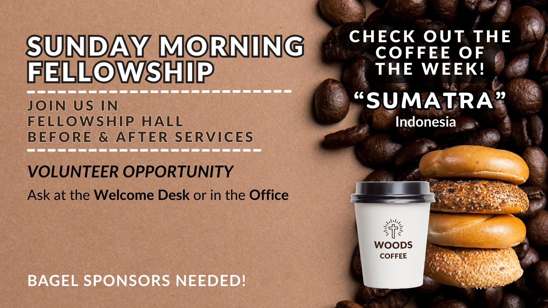 Don’t miss fellowship, coffee, and bagels every Sunday morning before and after services in Fellowship Hall!
