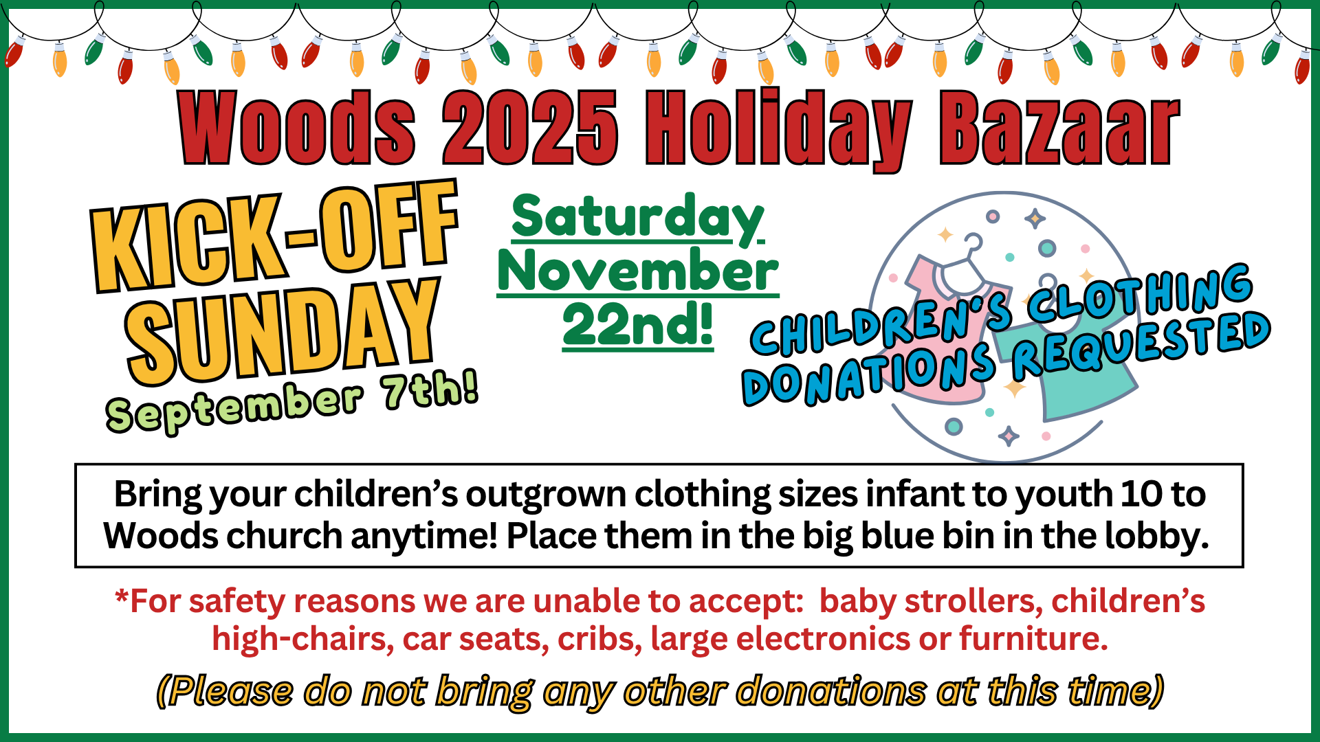 New this year, we will be offering children's clothing in sizes infant to youth 10. Please save your kids’ outgrown clothing and bring them to the church beginning Sunday, September 7. There will be a large rolling blue bin in the lobby for drop-off.