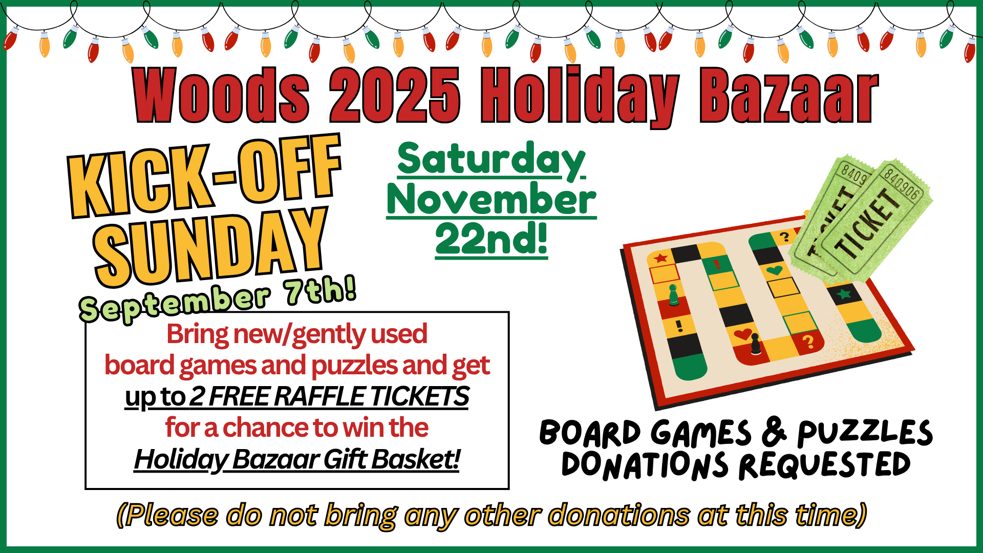 Bring new or gently used board games and puzzles on Kick-off Sunday, September 7, and get up to two free raffle tickets for a chance to win the Holiday Bazaar Gift Basket valued at over $200! The Woods Holiday Bazaar Table also will distribute cards for specific items to donate to the Sweet Shop for candy making.