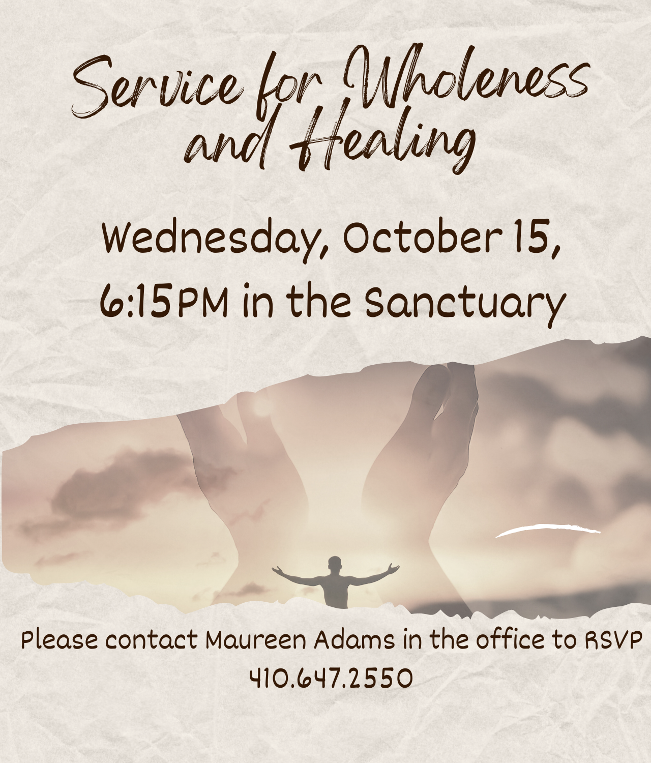 There will be a Service of Wholeness on Wednesday, October 15, 6:45PM, in the Sanctuary. This is a deeply spiritual service of prayer, laying on of hands and anointing by the Pastors and elders for those experiencing emotional or physical concerns.