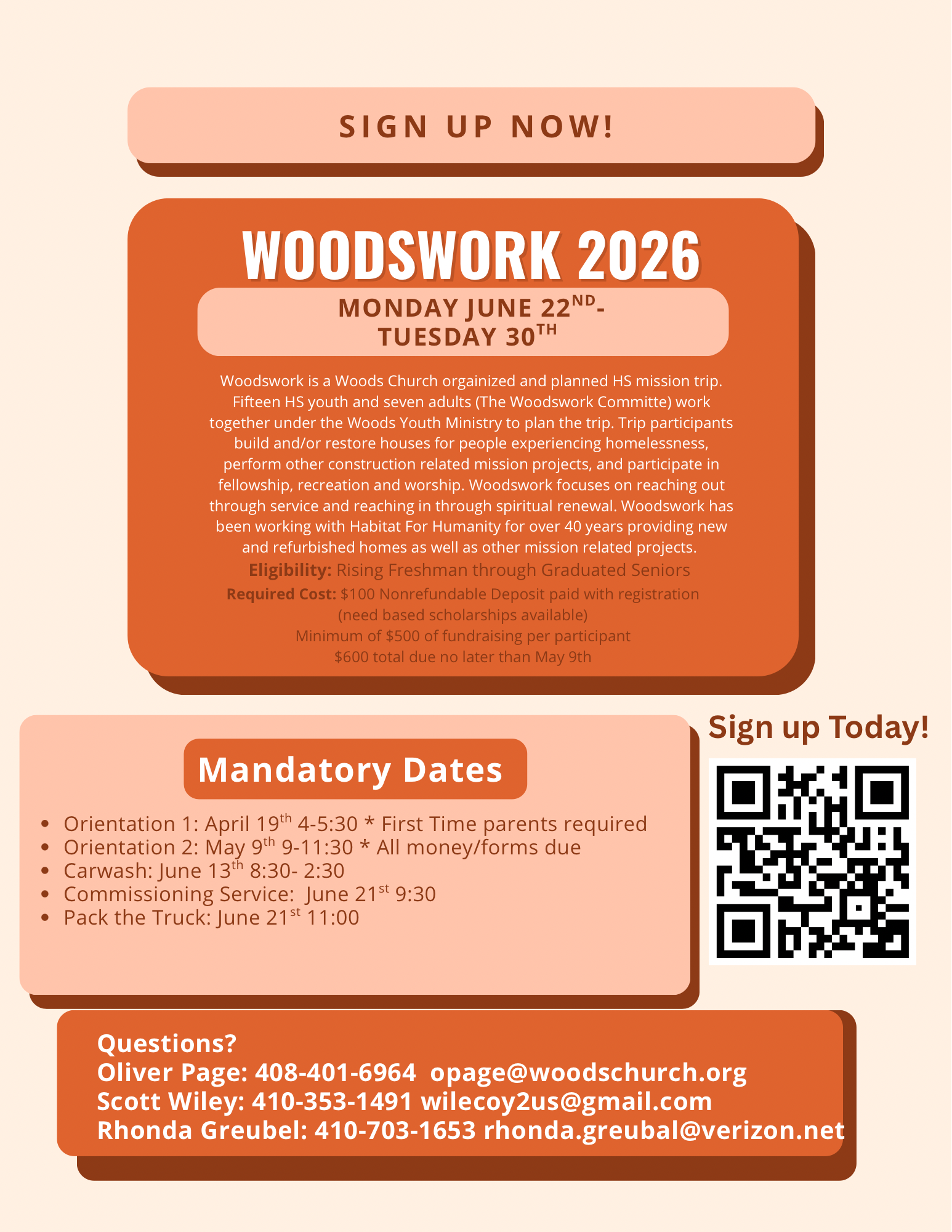 Over the years, Woods has remained active in the community here and abroad, challenging our young people to make a positive difference in Christ's name wherever they go.