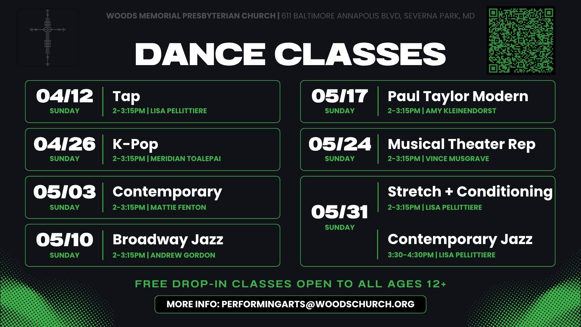 Join our Worship Ministry for a series of free dance classes this spring! Professional teachers are offering a variety of dance styles, including jazz, musical theater, contemporary, tap, yoga, and more!