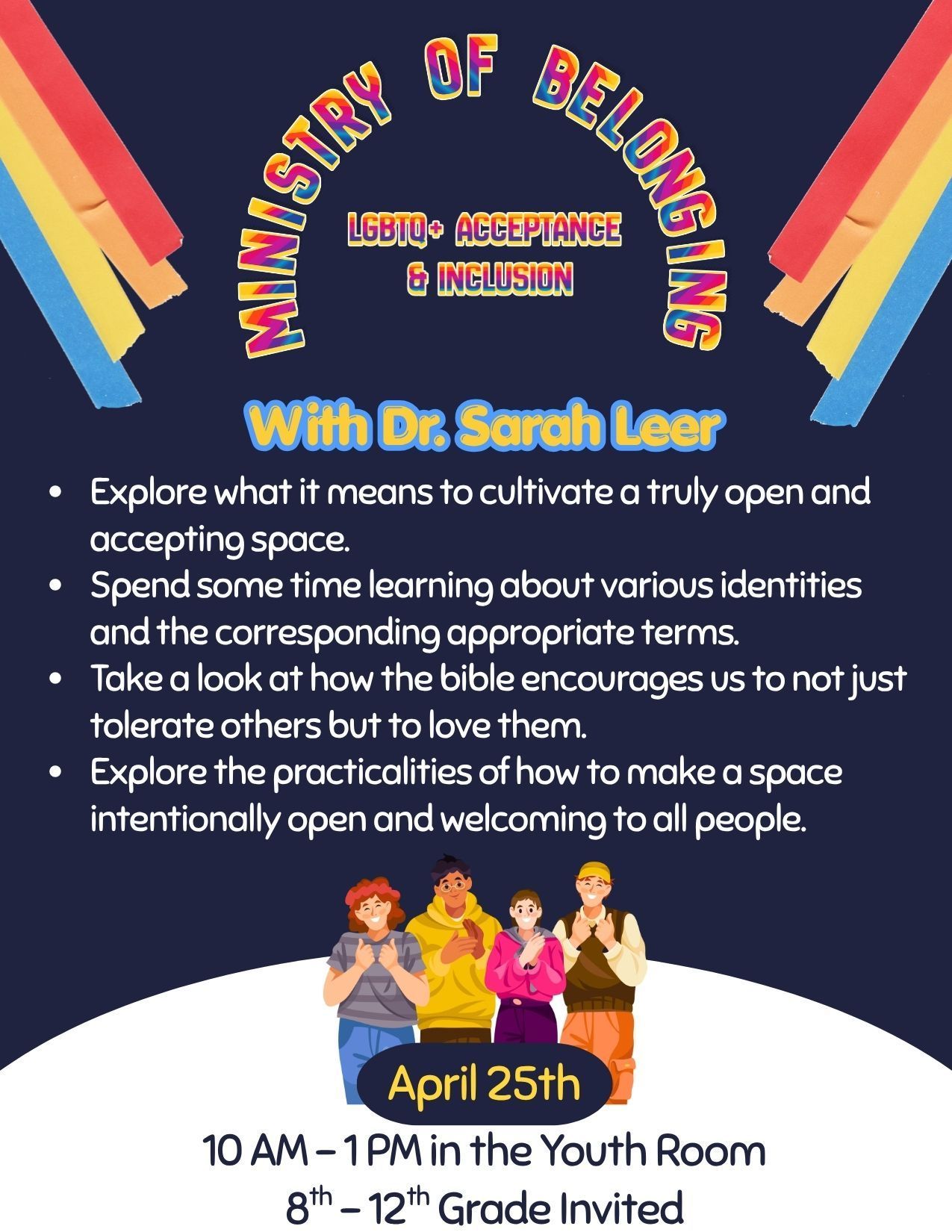 Youth grades 8–12 are invited to join us on Saturday, April 25, 10AM–1PM, for an insightful and meaningful workshop with Dr. Sarah Leer. The goal of the workshop will be to explore what it means to cultivate a truly open and accepting space, with a focus on queer identities. We will spend time learning about various identities and the corresponding appropriate terms, take a look at how the Bible encourages us to not just tolerate others, but to love them, and explore the practicalities of how to make a space intentionally open and welcoming to all people.
