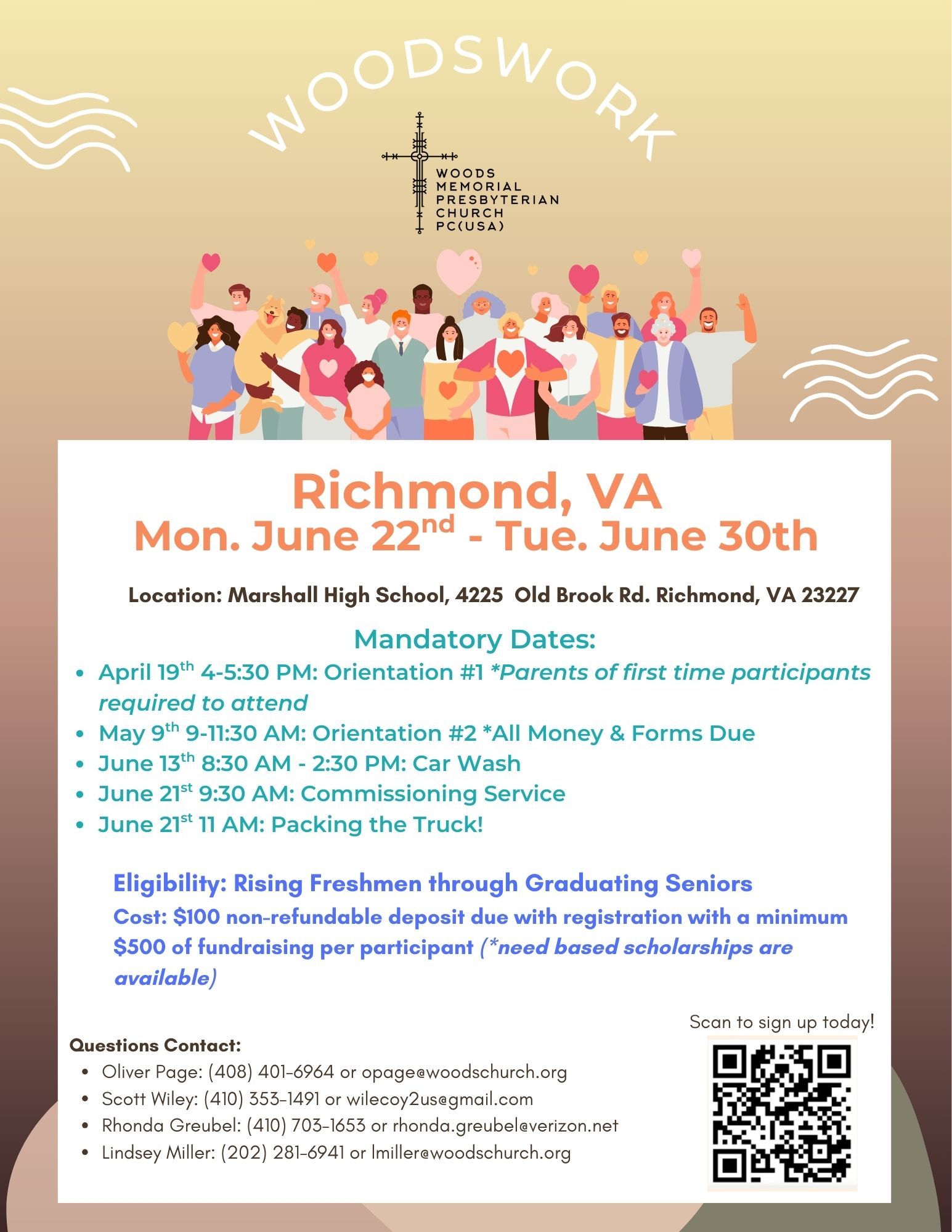 Woods adults are welcome to join us on a Mission Trip, Monday–Saturday, April 20–25. We will travel to Richmond, Virginia, and work with the Richmond Metropolitan Habitat for Humanity affiliate. We are looking for 10+ volunteers.